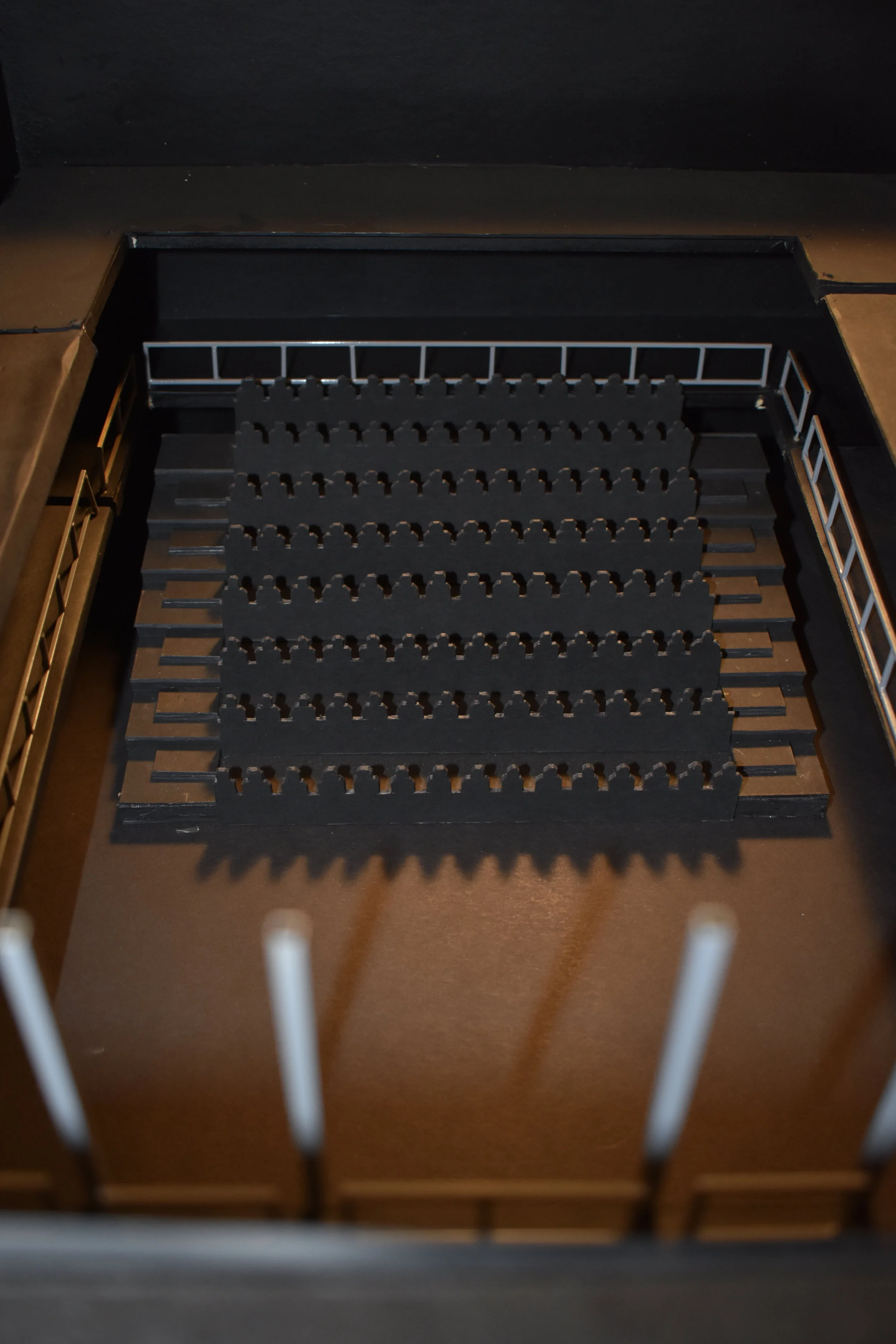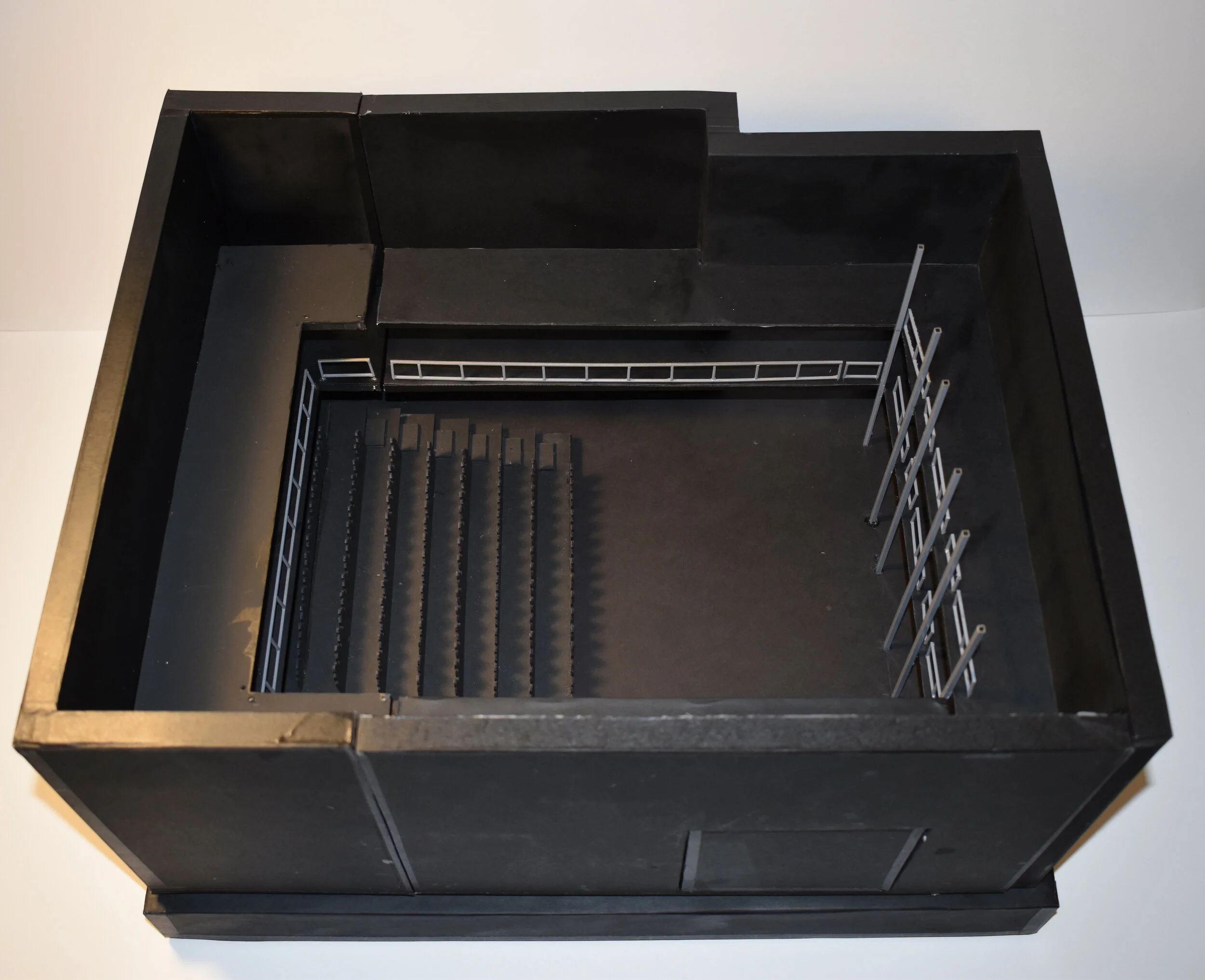 1/4” = 1’0” scale model of Duke University’s Von der Heyden Theater for the future use of Duke’s Department of Theater Studies. The model includes two removable walls to allow for visual access, three removable panels for side and back lighting, removable metal railings, and a removable riser.